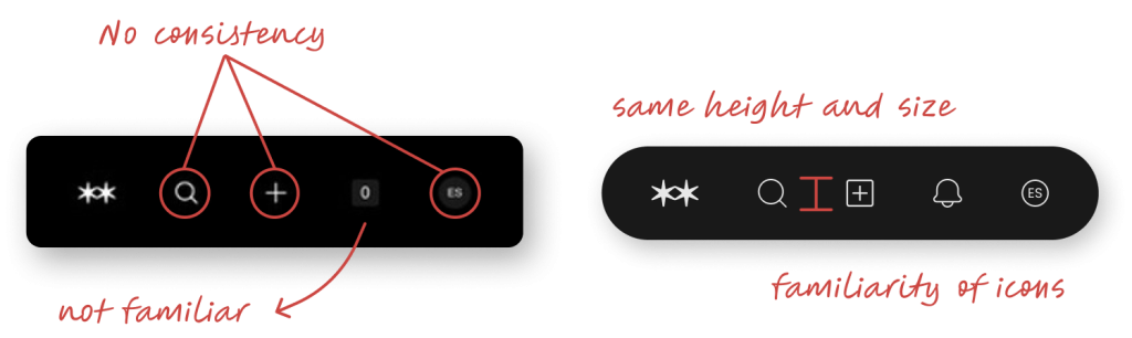 Eliminating arbitrary variation. By removing the inconsistent circle enclosures on only some icons, the redesign closes the gulf of evaluation — the user no longer has to wonder why some icons are wrapped, and others aren’t, because they all behave visually the same way.