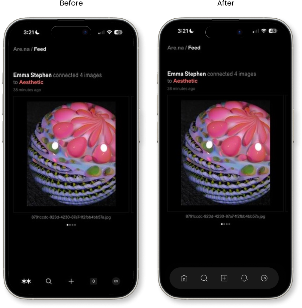 A container that declares itself. The redesigned nav bar sits inside a distinct, rounded pill-shaped background, separating it visually from the content above. Norman calls this perceived affordance through contrast. When an element is visually bounded, the user understands it as a discrete, interactive region rather than icons floating ambiguously at the bottom of the screen. Without the background, the original nav bar bleeds into the dark interface, making it harder for the eye to locate and trust it as a consistent anchor point. The container doesn’t add complexity; it adds clarity of structure, telling the user exactly where navigation lives before they even think to look for it.