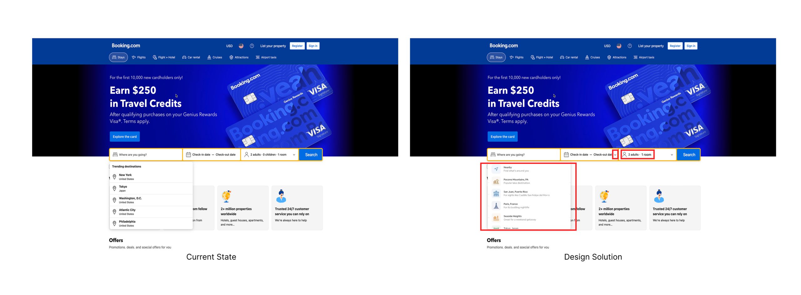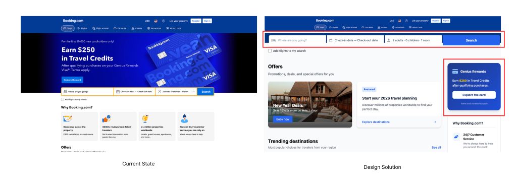 Through an in-depth design critique of Booking.com’s homepage, I identified a fundamental tension: information prioritization conflicts with user objectives. This issue manifests across multiple interface layers, creating systemic usability challenges.
