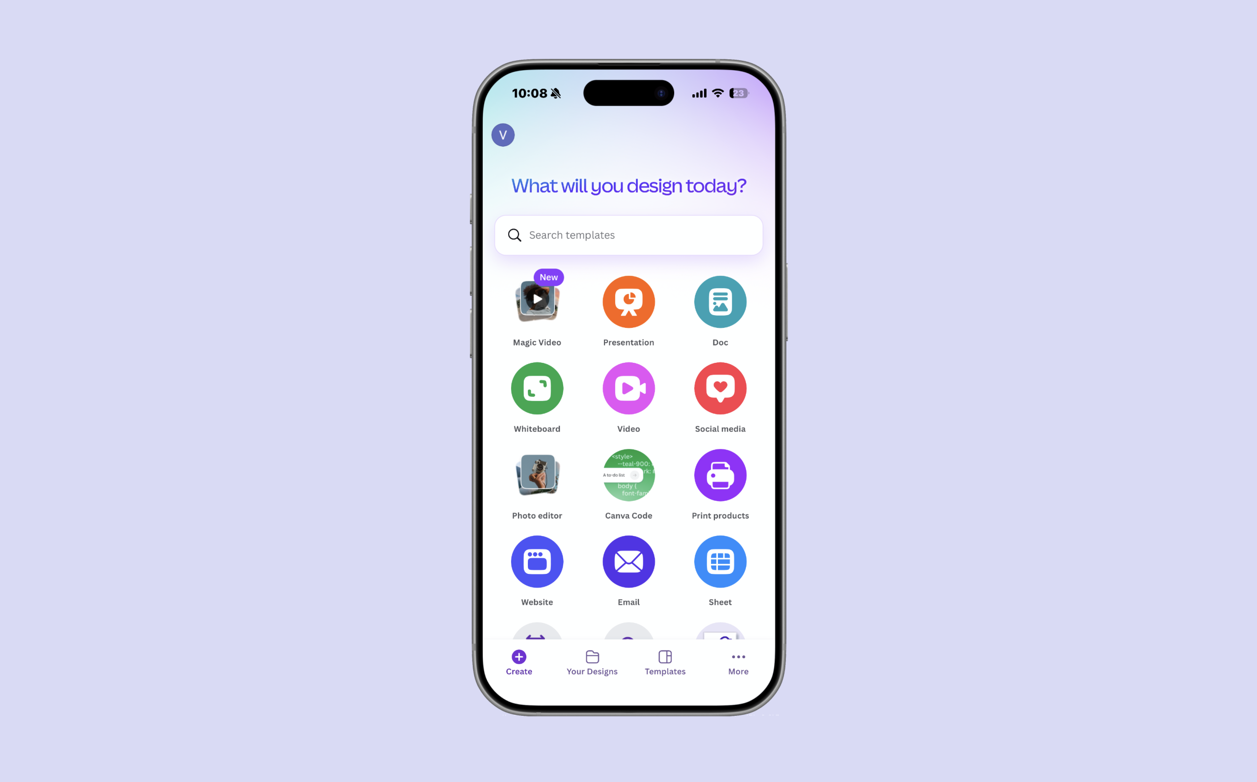When users begin editing in Canva mobile, the interface clearly communicates how to get started. The prominent “Create” button functions as a strong signifier, signaling the primary action available. This supports good discoverability and a clear conceptual model, where users understand that pressing this button will initiate a new design.