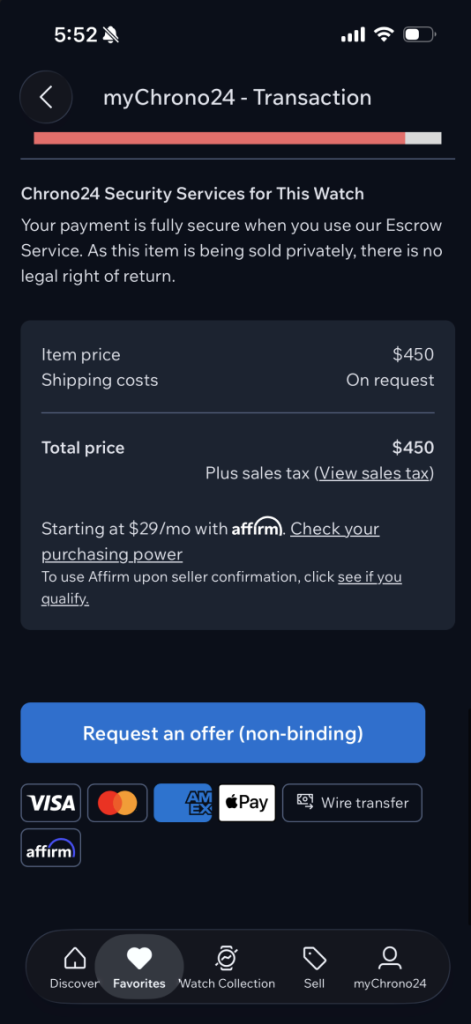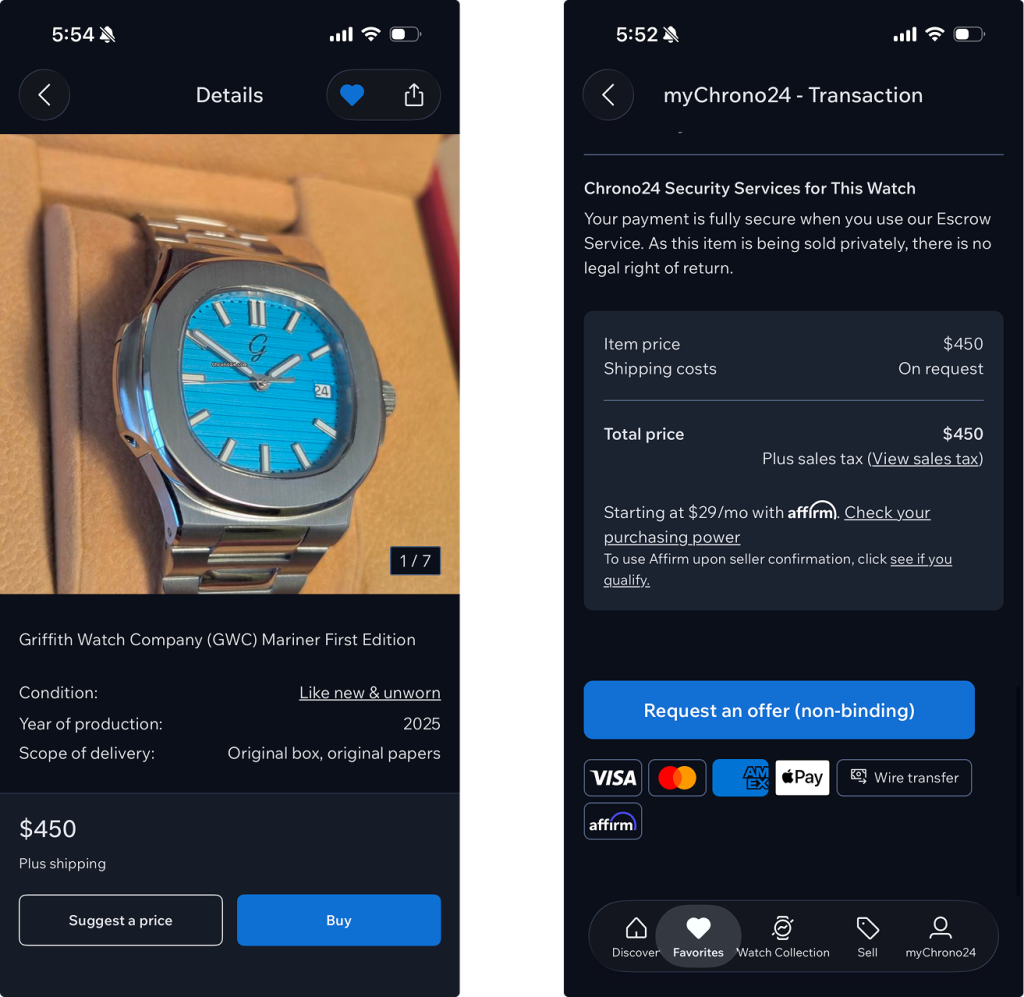 To make a purchase, the user is given two options at first, to “Suggest a Price” or to “Buy” the product. The first provides immediate feedback, opening a chatbox with the seller. This reduces the “Gulf of Execution” and the user understands that this is a negotiation tool. The latter adds the product to their cart and asks them to fill out their information, but the button at the bottom asks to “request an offer (non-binding). This can be confusing to the user, as this suggests that the user would still need to have some kind of dialogue with the seller to make their purchase. The lack of a clearly visualized progression provides little to no feedback to the buyer. A clearer transaction journey indicator could improve confidence and perceived safety, reducing uncertainty and friction. Contrary to the “Categories” page that has constraints and error prevention, users may misinterpret terminology or authencity guarantees as they are not clearly stated, increasing cognitive errors. Stronger constraints, such as clearer warnings or earlier cost estimates, could further reduce risk.