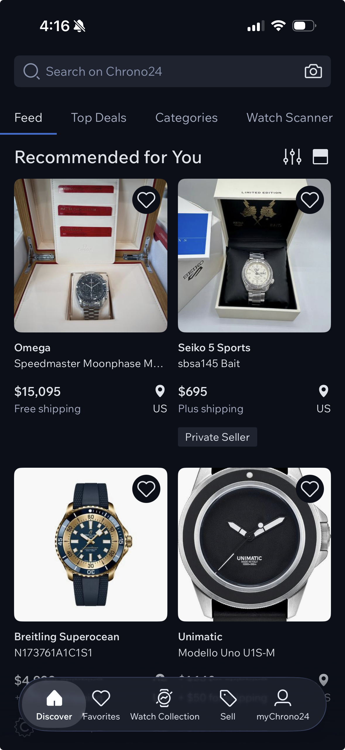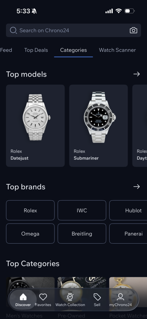Chrono24’s app opens to a “Feed” home page that shows the users various products that are recommended to them. The app effectively utilizes signifiers and affordances, making possible actions clear. The text inside the search bar lets the user know they can look for their specific needs, and the highlighted tab “Feed” lets the user know where they are within the app. Product cards display images, brand names, and prices in a hierarchy familiar to users of e-commerce platforms, making it immediately apparent that items are interactive. Users also received immediate feedback when they click the heart in the corner of each card, which fills in and signifies that the item has been added to a favourites list. The bottom navigation bar also has highlighted icons, signifying which page the user is on currently, with easily recognisable icons (like a heart for “Favourites”).