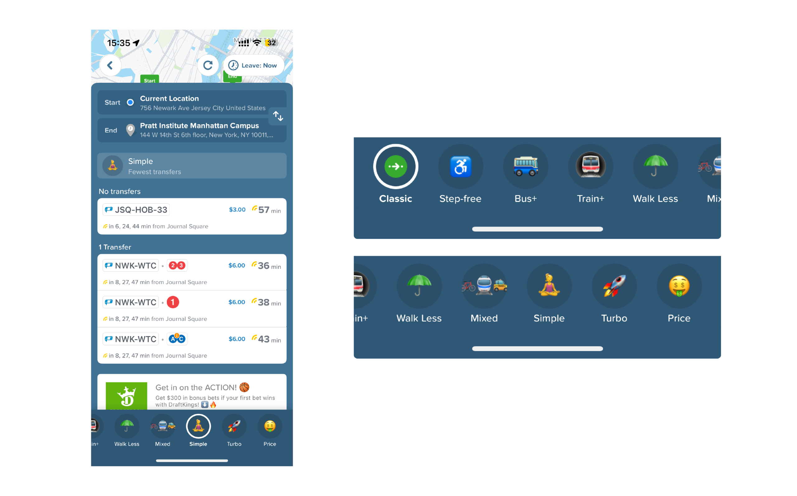 Citymapper’s mode filters like Classic, Walk Less, Turbo, Price and so on act as well-designed constraints, that narrow down the routes based of user’s preference, enforcing user agency. The interface supports flexible route explorations by keeping these options as high-level preferences rather than rigid rules.