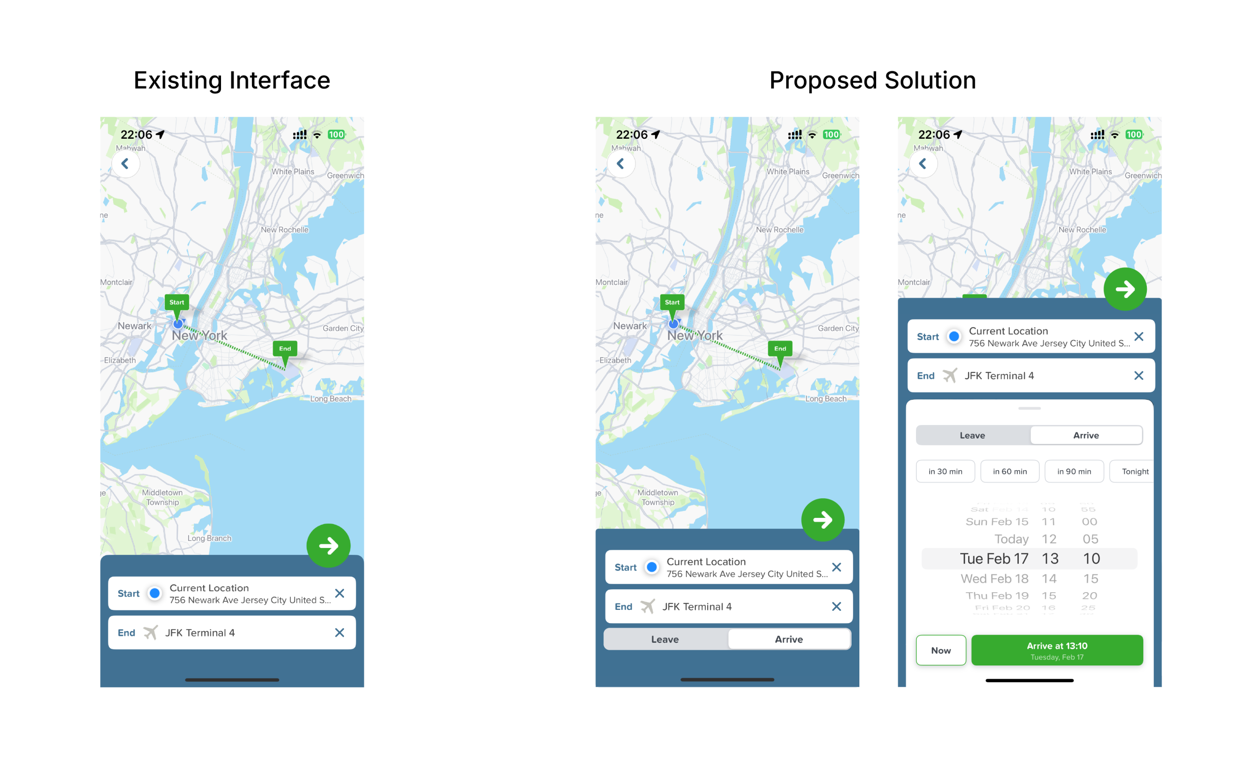 To address this issue, the user flow should introduce time selection alongside “start” and “destination”, rather than deferring it. Adding the “Leave at”/ “Arrive by” toggle in the initial planning stage would reduce the gulf of execution and better match with the user’s mental models.