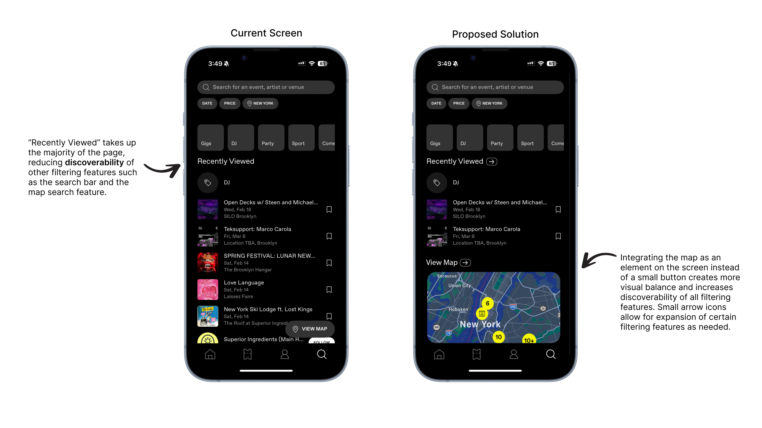 Additionally, the “Recently Viewed” section takes up most of the screen. This creates an unbalanced hierarchy that pulls attention away from the search bar and filtering tools, even though those are the user’s primary controls for finding upcoming events. This disrupts discoverability as the interface suggests that revisiting past events is more important than actively searching.