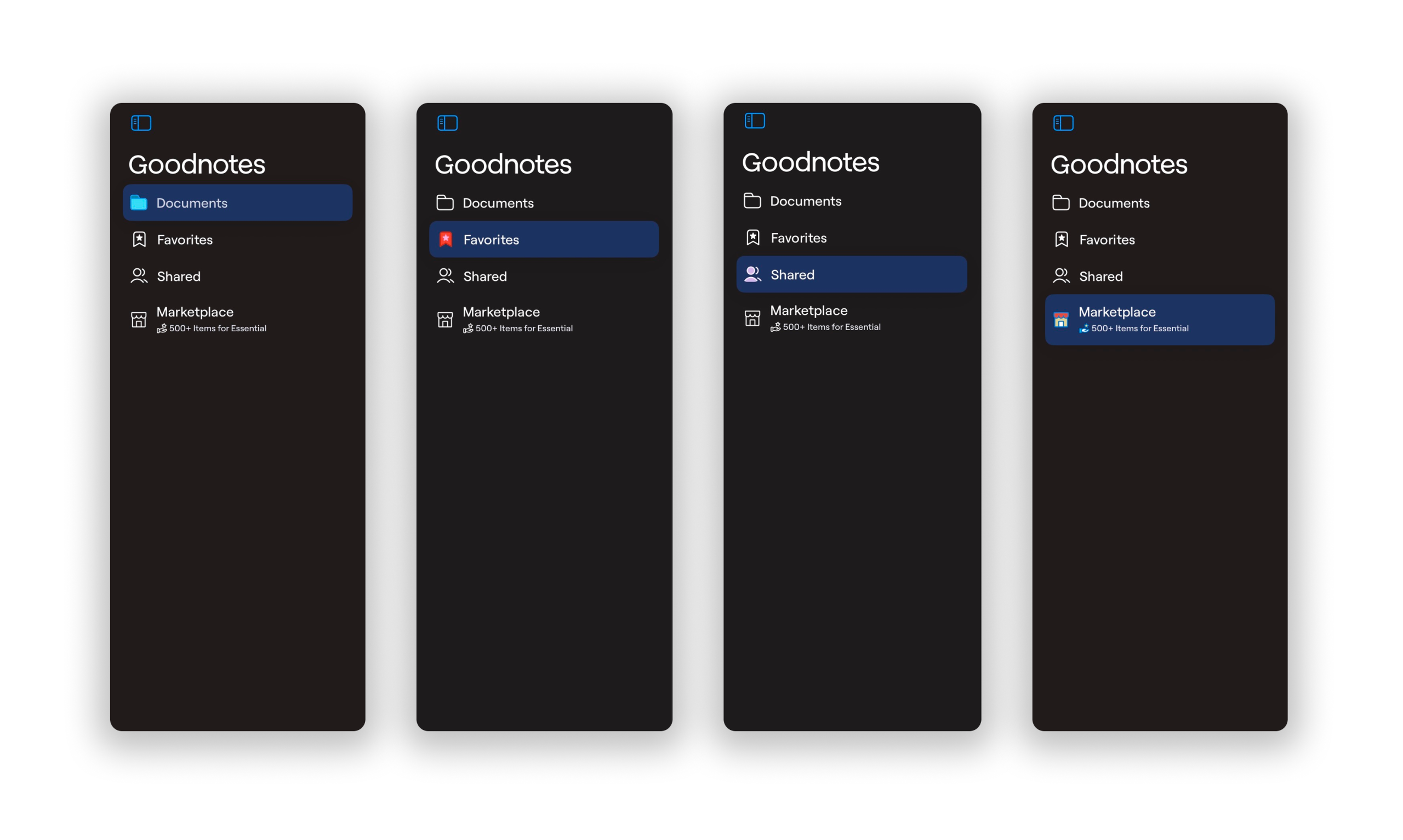 The navigation sidebar found to the left of the screen includes four icons and copy indicating Documents, Favorites, Shared, and Marketplace. The icons and copy are great signifiers of the page each tab leads to, allowing for clear discoverability for the user.
