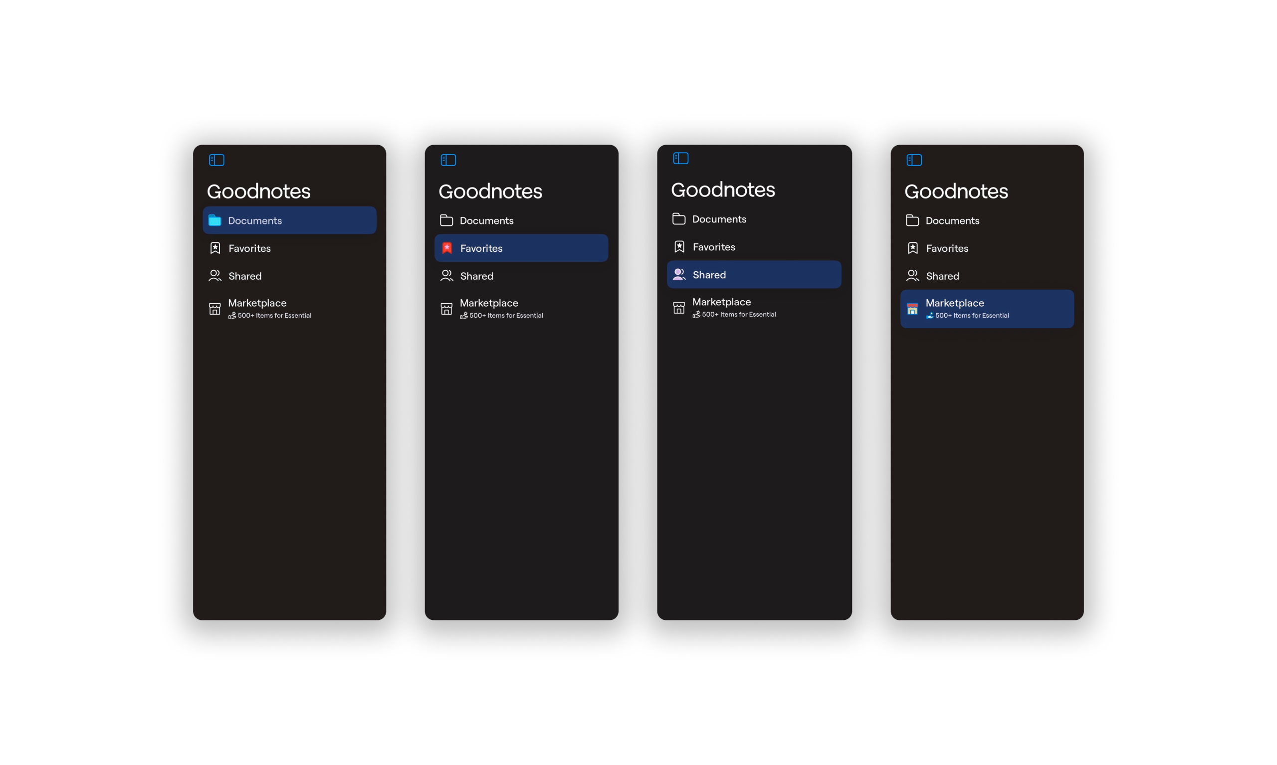 The navigation sidebar found to the left of the screen includes four icons and copy indicating Documents, Favorites, Shared, and Marketplace. The icons and copy are great signifiers of the page each tab leads to, allowing for clear discoverability for the user.