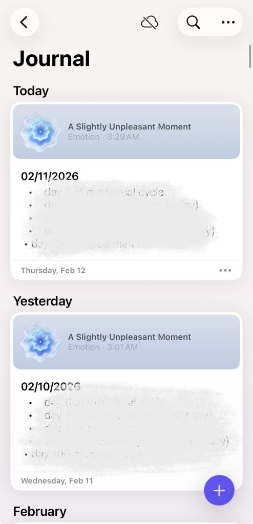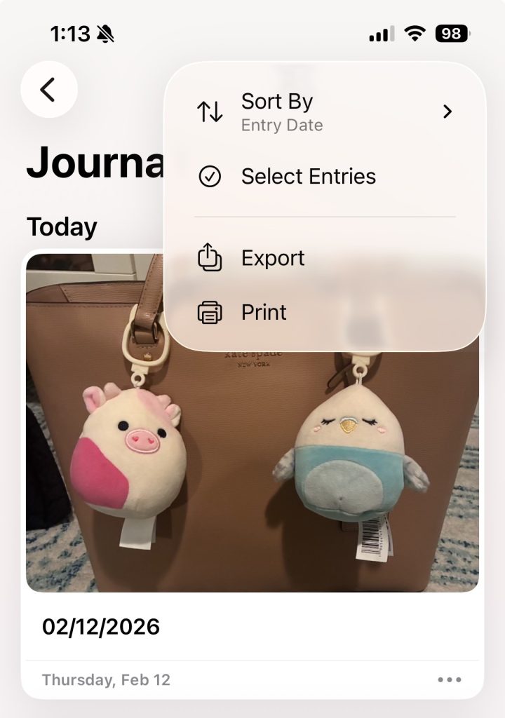 One of Journal’s strengths is its application of natural mapping, specifically in its main timeline view. The first screen a user sees upon opening the app are their entries, and they are displayed in a vertical chronological list, mapping directly to users’ mental model of time progression. Tapping an entry opens it; swiping returns you to the list. This aligns well with Norman’s idea that good mappings reduce the need for instructions.
