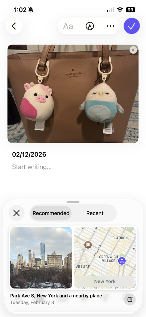 Journal relies heavily on algorithm suggestions (when Journal Suggestions setting is enabled), prompting users to write based on recent activities. While this may reduce the gulf of execution by helping users decide what to write about, it also introduces a problematic constraint of over-suggesting. Suggestions dominate the entry creation flow, subtly nudging users toward certain types of content (photos, workouts, locations) over true free-form reflection.