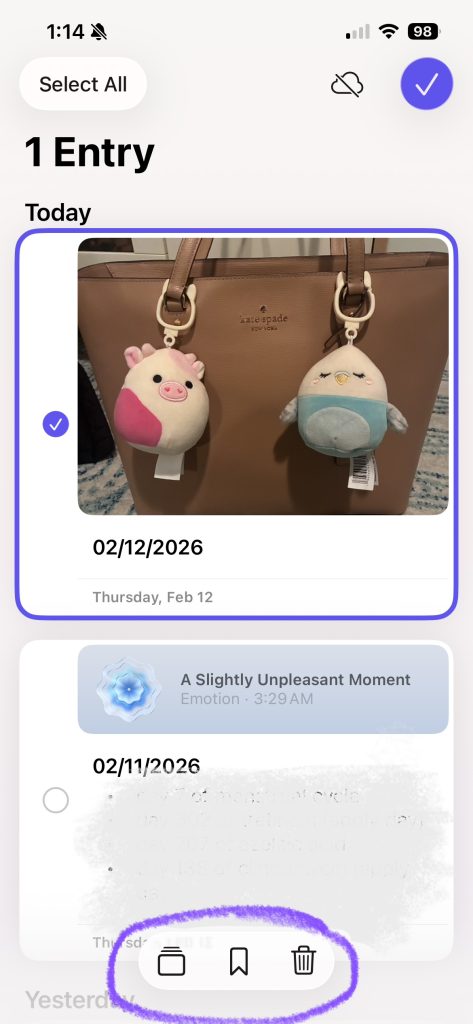 Journal’s minimal aesthetic, while visually appealing, hides several features such as filters, bookmarks, and insights. These features exist but are buried behind icons with weak signifiers, making the app’s conceptual model unclear, especially to new users of the app. Users may assume Journal is “just a simple list of entries,” without ever realizing its broader capabilities.