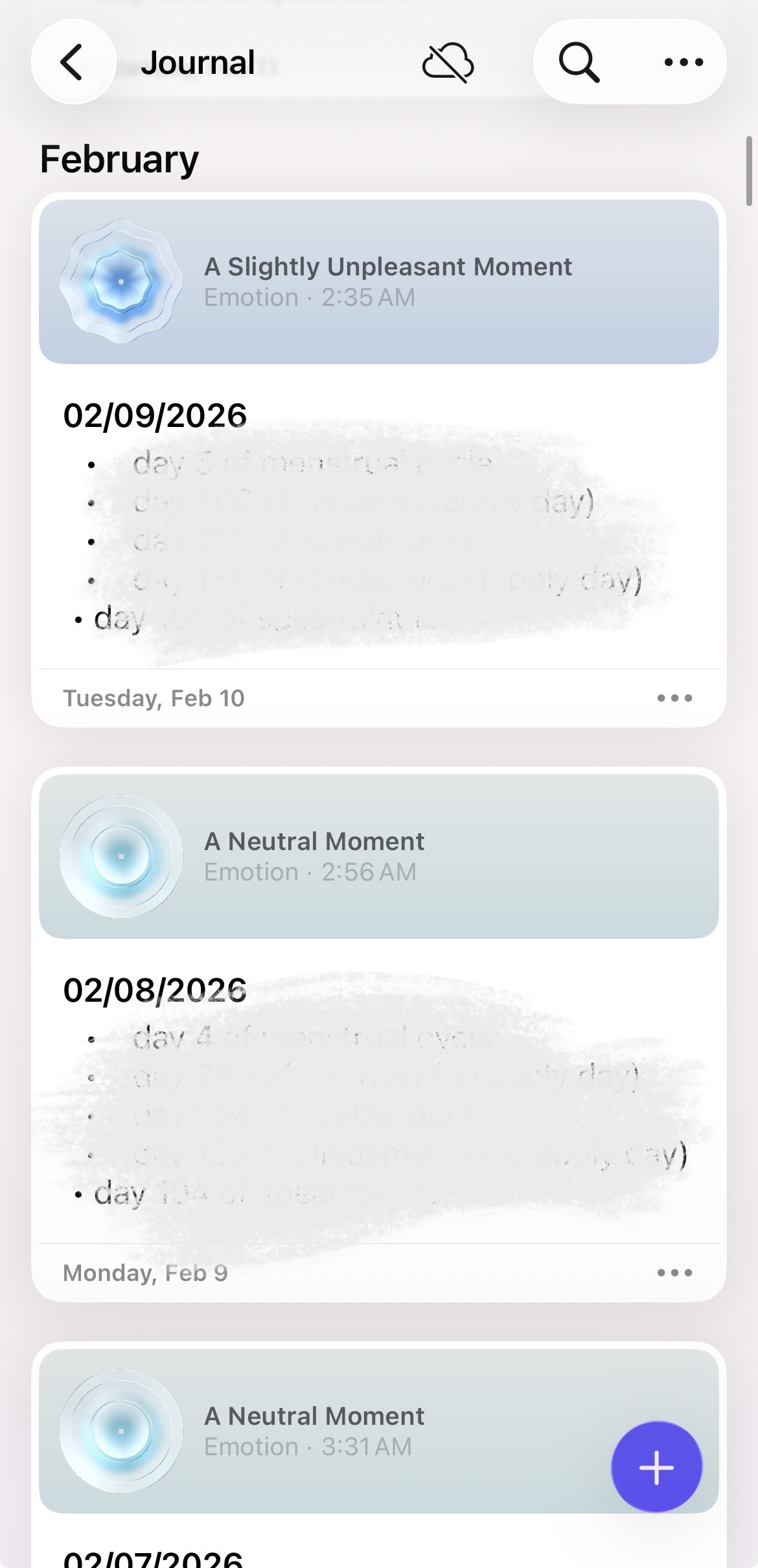 Potential Fix: Increase the prominence of the “+” button by pairing it with a text label such as “New Entry” or by using a larger floating action button. This would strengthen the signifier and better communicate the system’s intended action without adding clutter.