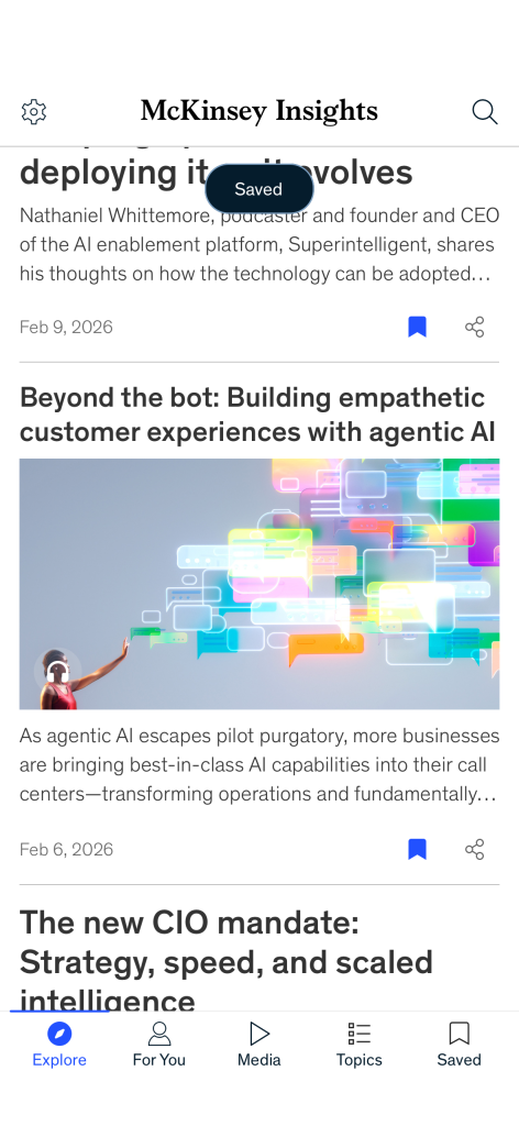 In many consumer media apps, the presence of a persistent mini player or clear play controls acts as a strong signifier. It helps users build the right conceptual model that this is not just an article list, but an active media experience. In the McKinsey Insights app, the Media tab feels visually similar to the reading feed, which weakens the mapping between the user’s goal, such as “I want to listen to something,” and the system’s presentation of content.