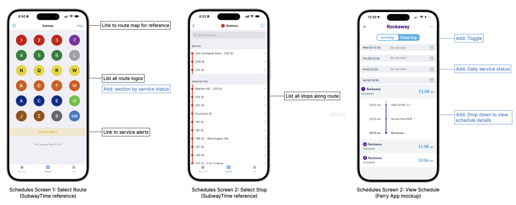 If users are considering taking the ferry but are flexible on timing or don’t need directions to/from the ferry landing, they may choose to browse schedules rather than search for directions. In this example, the user goal is to find out what days and times a ferry goes to Rockaway, and from which ferry stops.
