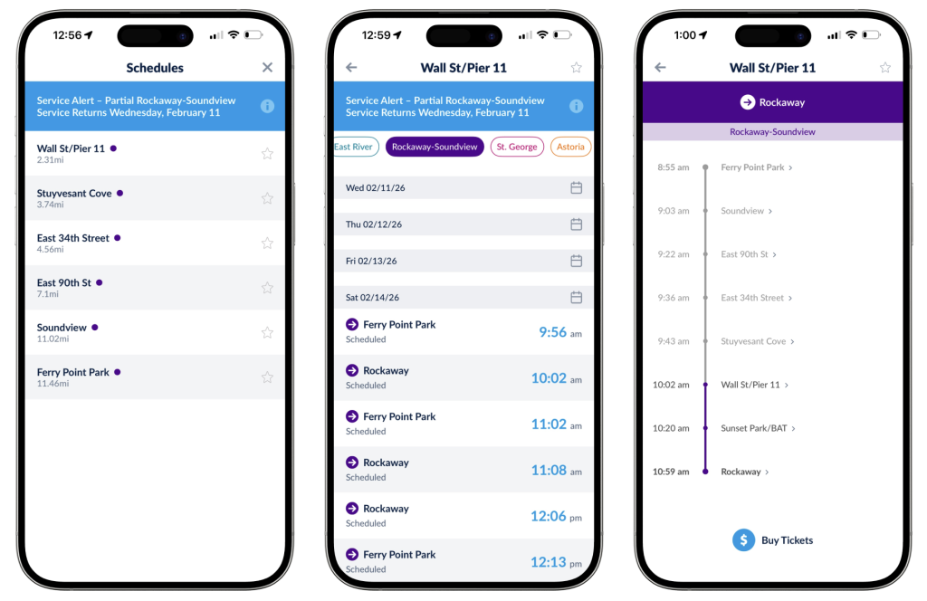 The next screen (fig. 2, middle) includes colored badges across the top, suggesting the colors do correspond to ferry lines (and that Rockaway is part of the purple line). The purple arrow icons pointing towards the stop names signify that these stops are destinations, and the stop selected on the previous screen must be the origin. Here, the system image doesn’t match the user’s conceptual model or goals, which would have them choose their destination first (the goal is to go to Rockaway, not to travel somewhere from Wall St). The user also comes across another constraint: there are no options to choose from prior to Saturday (even though the service alert says that the line resumes service on Wednesday).