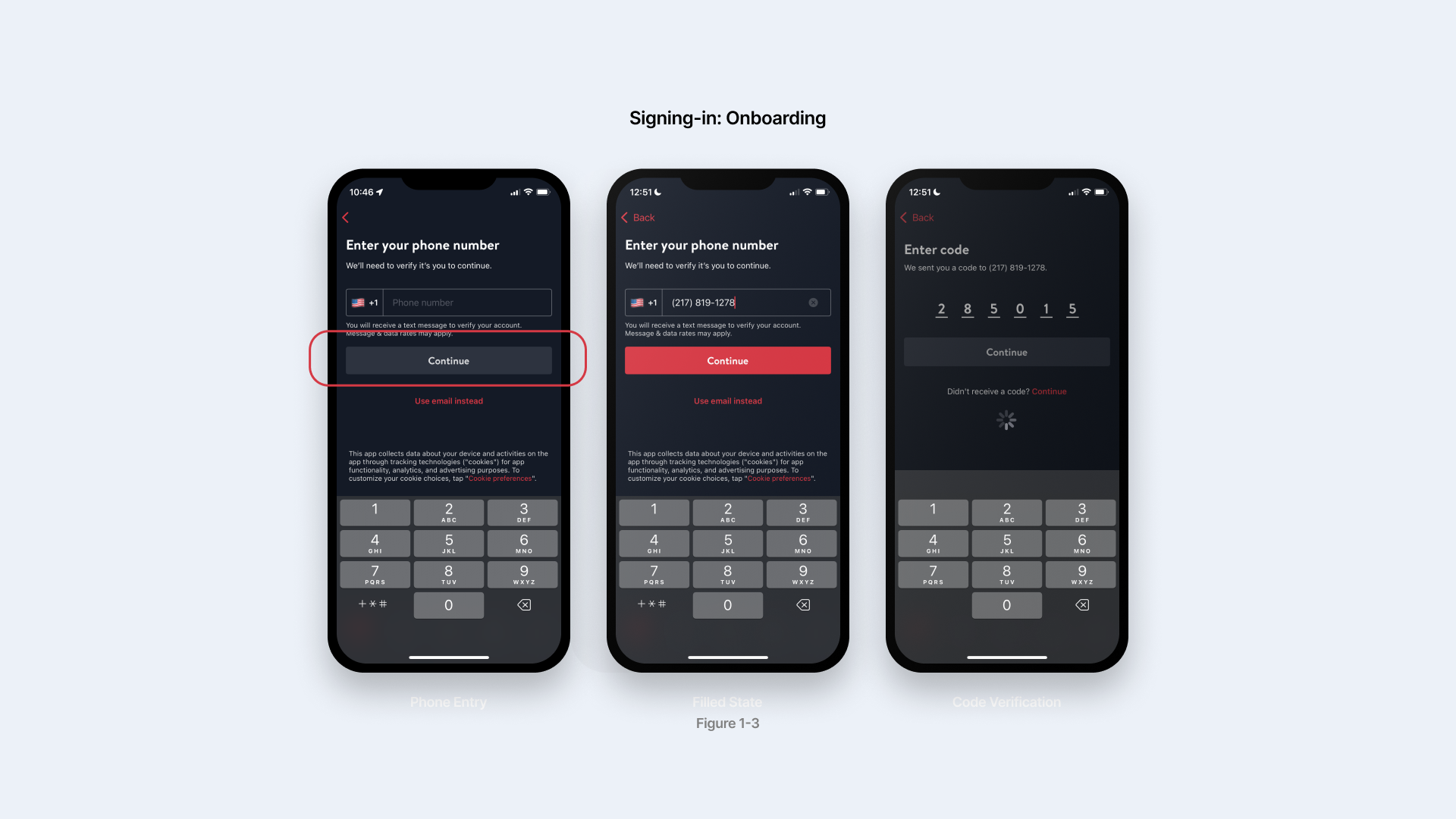 The sign-in pages (figure 1-3) utilized the classic phone number verification system. However, the interface here is a good example of how feedback and signifiers play an important role in bridging the gulfs of evaluation. When you finish typing a number, the Continue button turns red as an active state, signifying executable action next, and the system automatically load when you enter verification code with an loading icon on the screen, both are effective change in perception that makes it easy for users to compare the result with their goal: logging in. The automation of the process also serves as a physical constraint that prevents the users from distracting from signing up with the app.