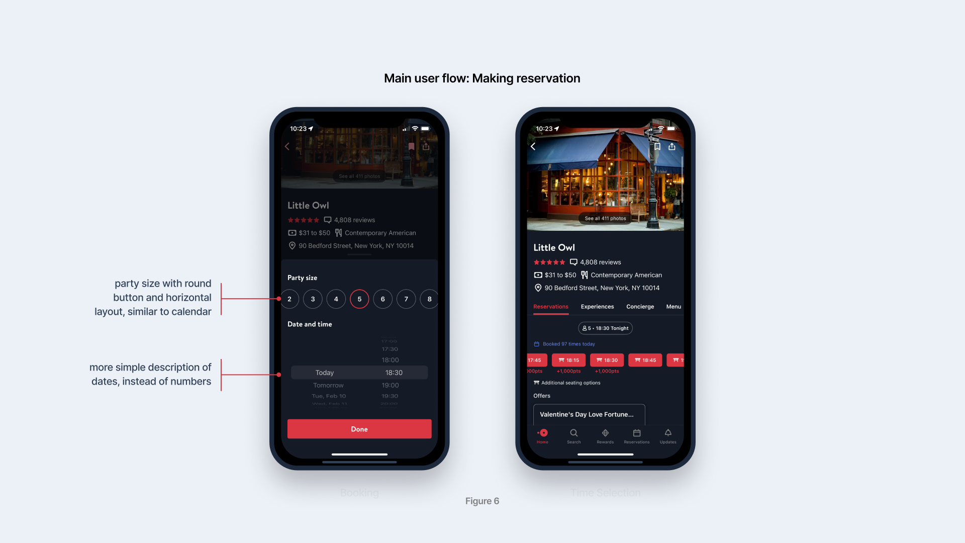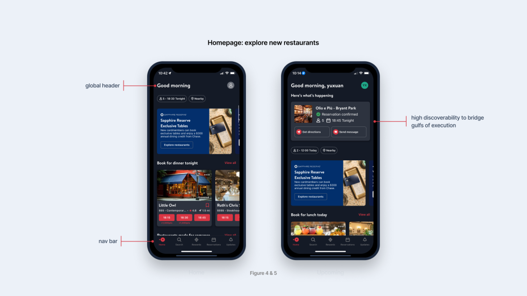 Figure 4 & 5 show the difference between new users and existing users’ homepage. First of all, the global header, identified as “Good morning” established the conceptual model of the app, which is a personalized assistant that is aware of the user’s needs. OpenTable follows a traditional hierarchical app design that features a consistent nav bar that directs users to Home, Search, Rewards, Reservations, and Updates.The use of red color on Home icon and text provides feedback for users to quickly understand their current location within the app.