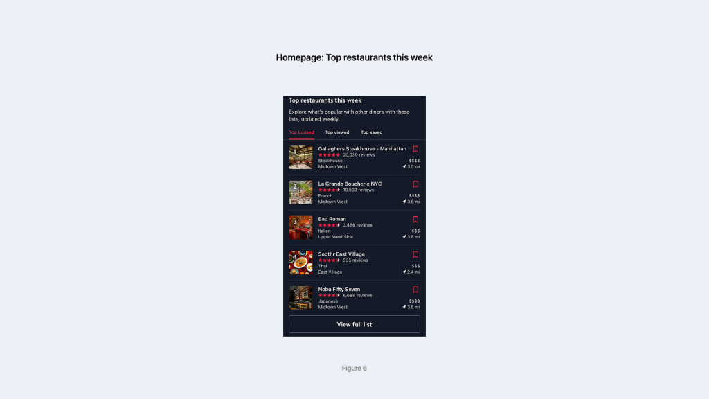 As a part of the homepage, Top restaurants this week (figure 6) features a scrollable vertical display that is built based on natural mapping, as the top restaurants are placed at the top of the list, and the vertical stack design is culturally relevant to the concept of ranking, employing the knowledge of the world. The ratings shaped in stars serve as natural signifiers that represent the general popularity, as the users are used to that conceptual model. The number of reviews in proximity to the stars serves as a secondary signifier that helps bridge gulfs of evaluation, as the user can quickly decide if the star ratings are trustworthy based on the volume of feedback. The top tabs that specify the category of the ranking list also serves to better bridge gulfs of evaluation, as users better understand the nature of evaluation in the ranking.