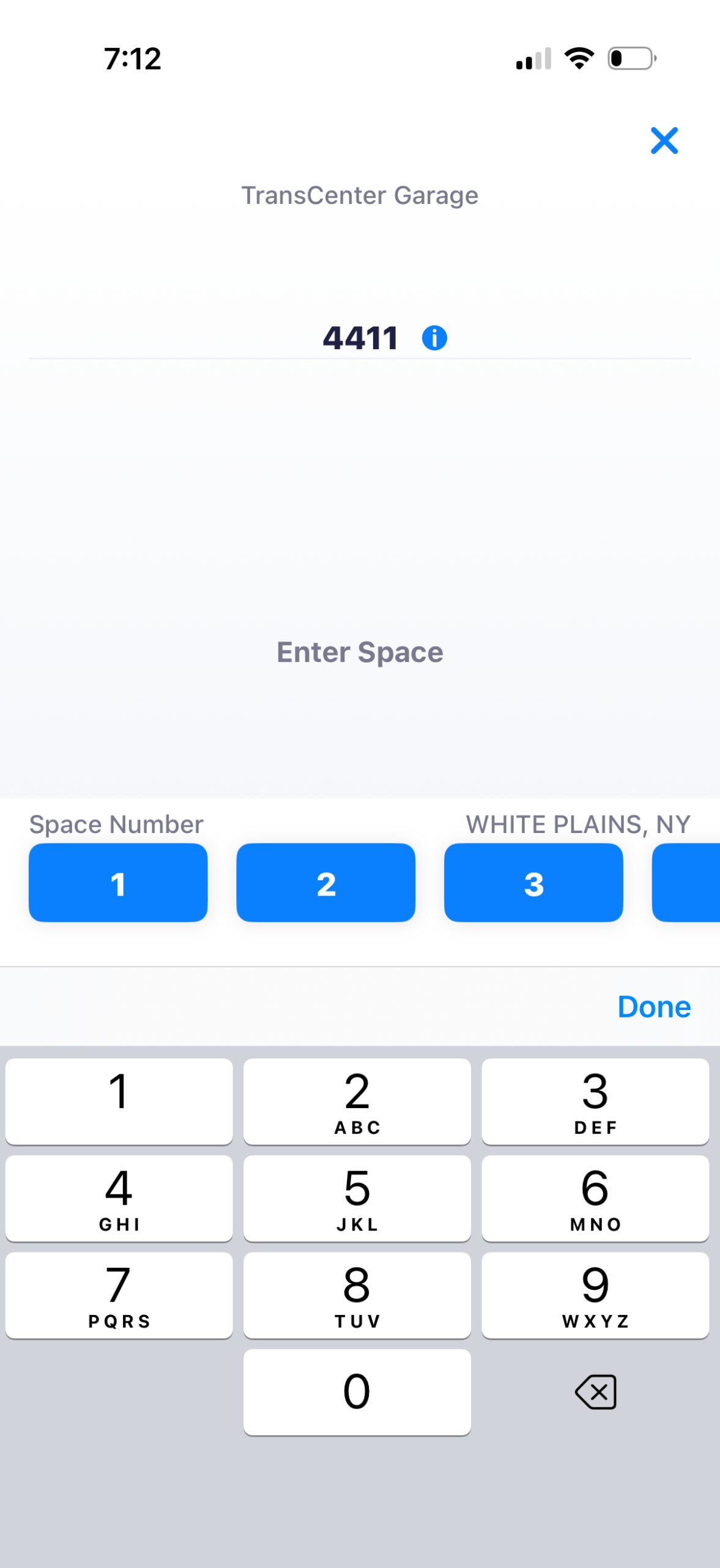 One flaw of this design is the lack of feedback about the name of the parking lot. Although on the third screen of this flow there is a label stating “Trans Center garage” and “White Plains, NY” at the top and side of the screen, the size and font make this easy to miss. Additionally, the user has to enter the zone number before they can even access this information. To make the feedback stronger, designers could include labels on the second screen of this flow where the name of the lot shows up next to the zone number to inform users they are selecting the desired lot.