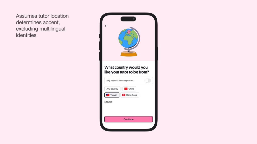 The only problem I had is with the question “What country would you like your tutor to be from?” This conflates geography with linguistic identity, assuming that a tutor’s birthplace directly impacts their accent. But from my personal experience, I can tutor Chinese with a Taiwanese accent, yet I might set my location to Canada since that’s where I’m based and where I consider my primary linguistic context. Where should I set my location? Canada or Taiwan? The system would demand I choose one, but my linguistic identity can exist across both.