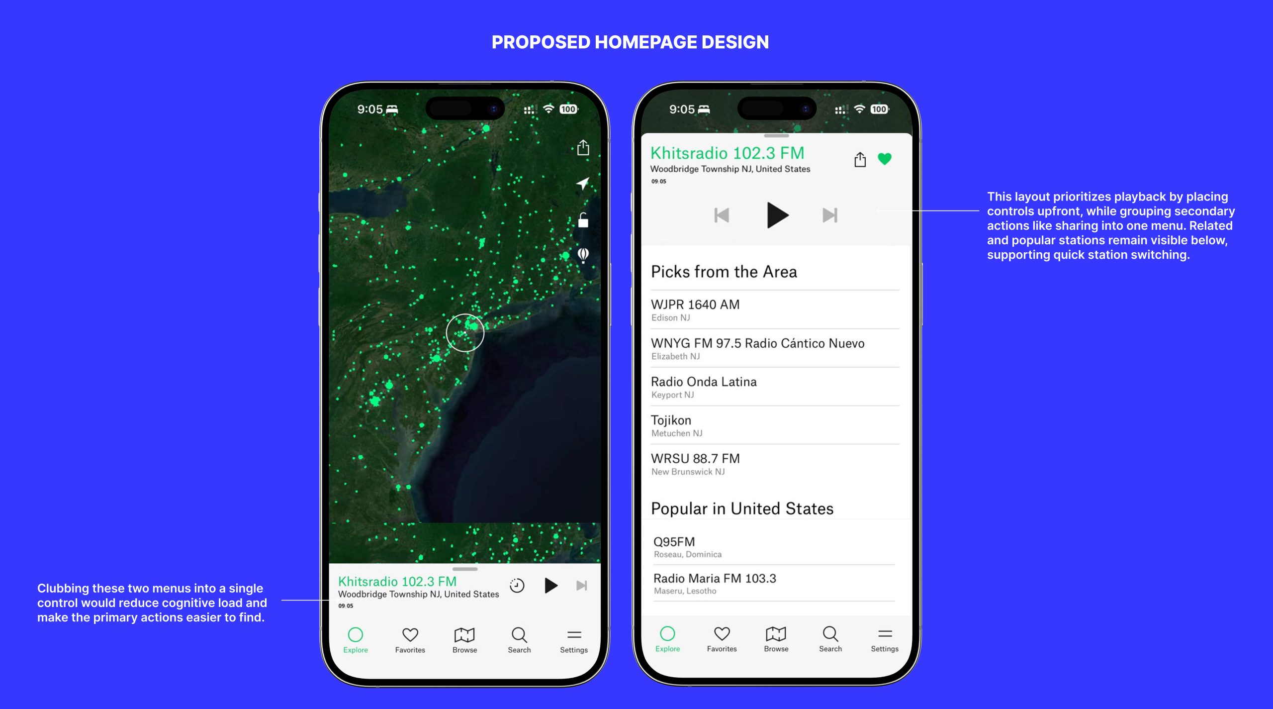 The proposed home screen redesign responds by consolidating station information, location, and time into a single, unified control area. Playback controls are given visual priority, while secondary actions such as sharing or saving are grouped together behind a single entry point. This reduces duplication, clarifies hierarchy, and makes the system state easier to understand at a glance. Nearby and recommended stations remain visible below, allowing users to switch quickly without navigating away.