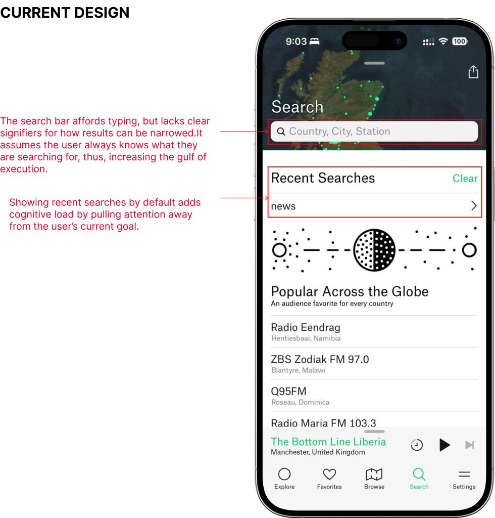 Search supports users with more specific goals, allowing stations to be found by country, city, or name. In its current form, search assumes users already know what they are looking for. Recent searches occupy prominent space even when no longer relevant, and results require extended scrolling. There are no visible filters or sorting tools to help users understand how results are organized, making exploratory search more effortful than necessary.