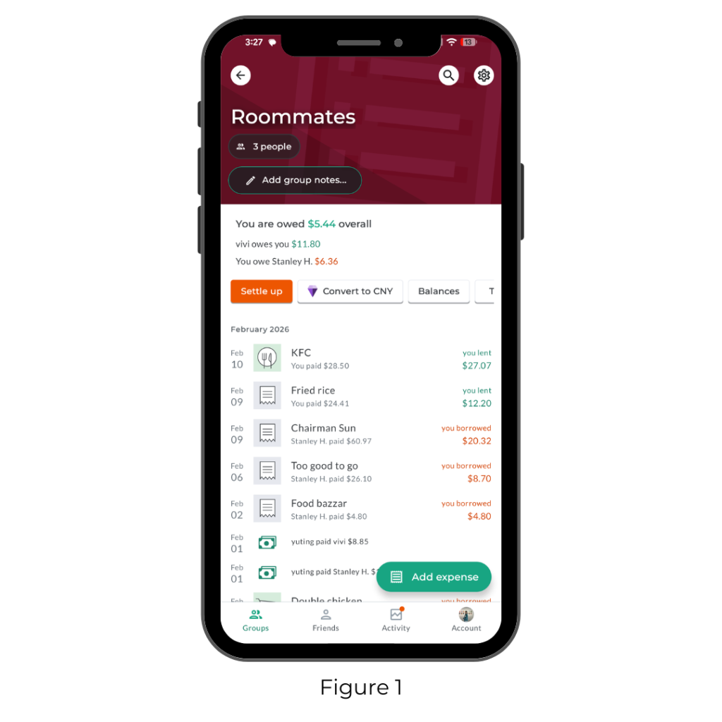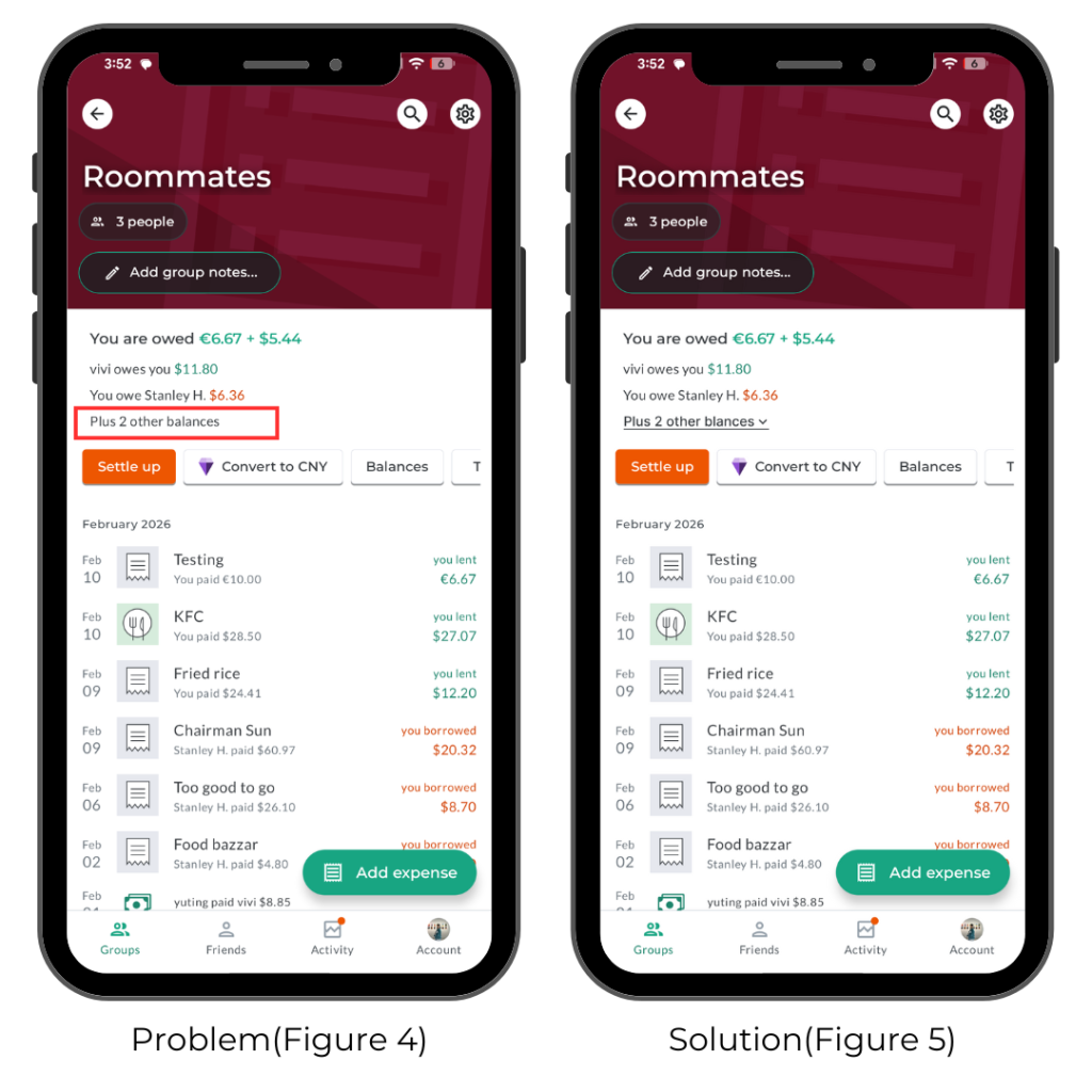 On each group’s main page, the balance summary uses green and red text as clear signifiers. However, when there are multiple currencies or more members, the interface displays a label like “Plus 2 other balances” (Figure 4). This design creates a conflict with the user’s mental model; because the text summarizes hidden information, users naturally expect to be able to expand it to see more details.