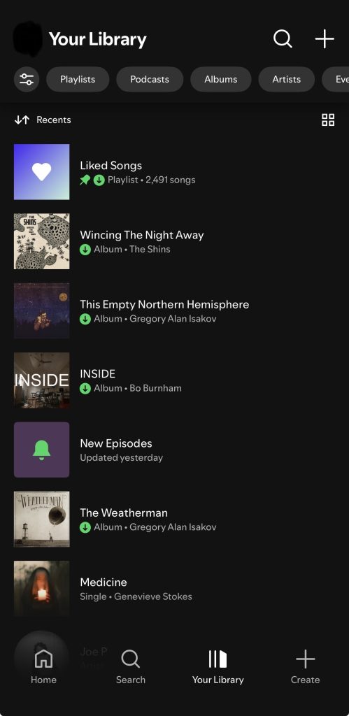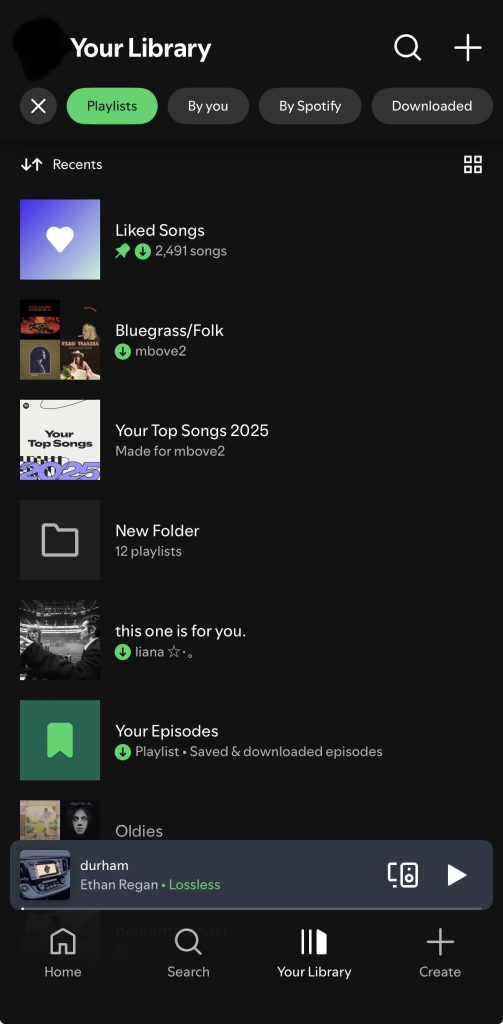 The Library screen (see Figure 1) is where users expect to find and manage saved content, which is supported through clearly labeled filters such as “Playlists”, “Podcasts”, “Albums”, and “Artists”. These labels function as strong signifiers, improving discoverability by making organizational categories explicit rather than relying on memory or icons. When categories like “Playlists” is selected, additional filters such as “By you”, “By Spotify” and “Downloaded” further clarify Spotify’s conceptual model by distinguishing between user-created and system-generated content (see Figure 2).