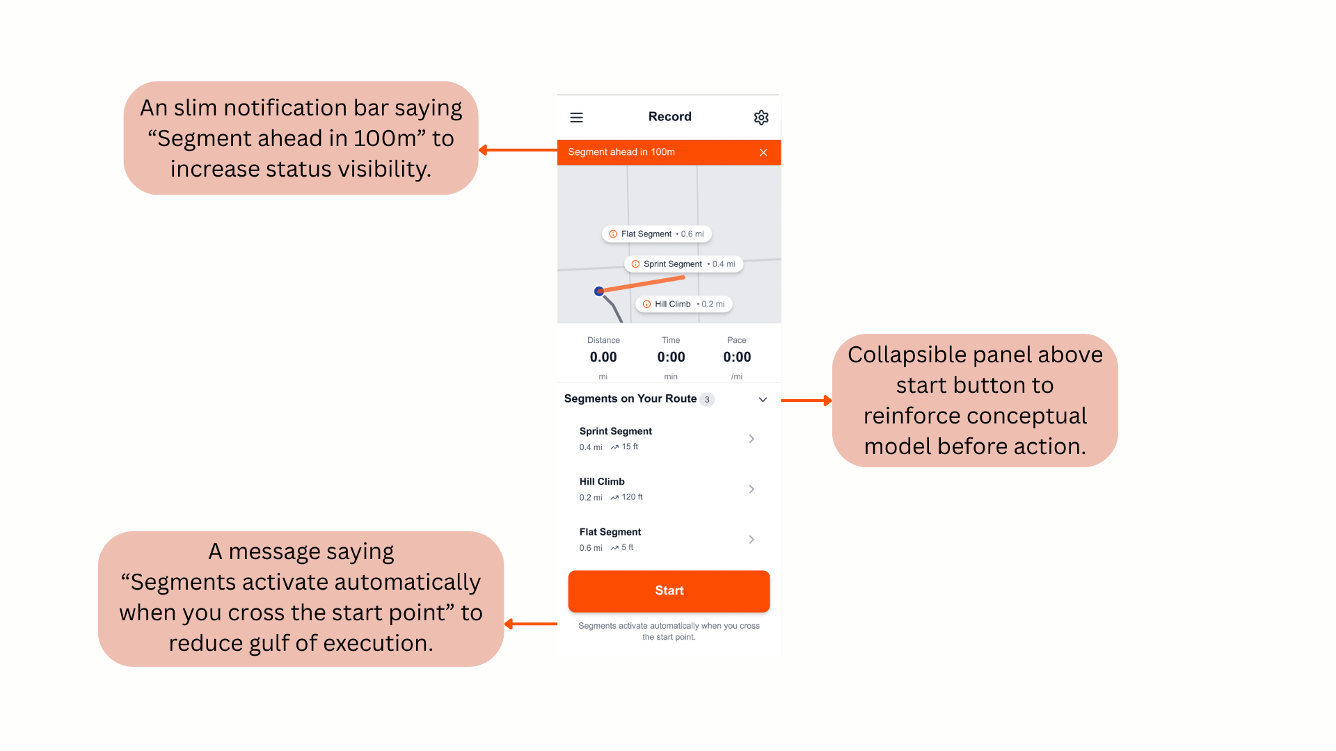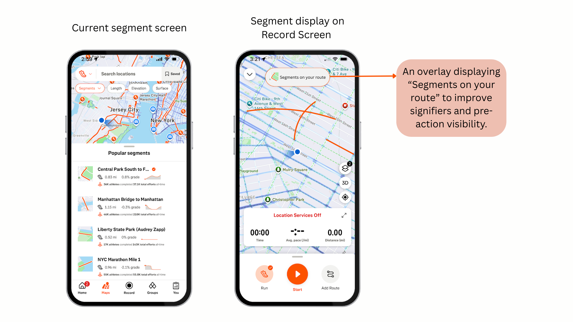 Introduce “Segments on your route” preview: On the record screen, visible route overlays would show upcoming segments before the activity begins. This strengthens signifiers and reduces uncertainty about participation.