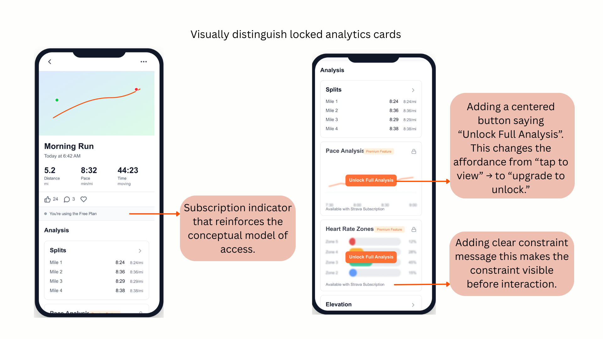 Strava’s premium feature where certain analytics appear available but become inaccessible only after interaction. This creates a false affordance. Good constraints should guide behavior before effort is invested, not after. When a user attempts to access deeper analytics and encounters a paywall, the experience increases friction and disrupts the trust. A clearer constraint system that visually distinguishes locked features before interaction that would align expectations with system capabilities and reduce the user frustration.